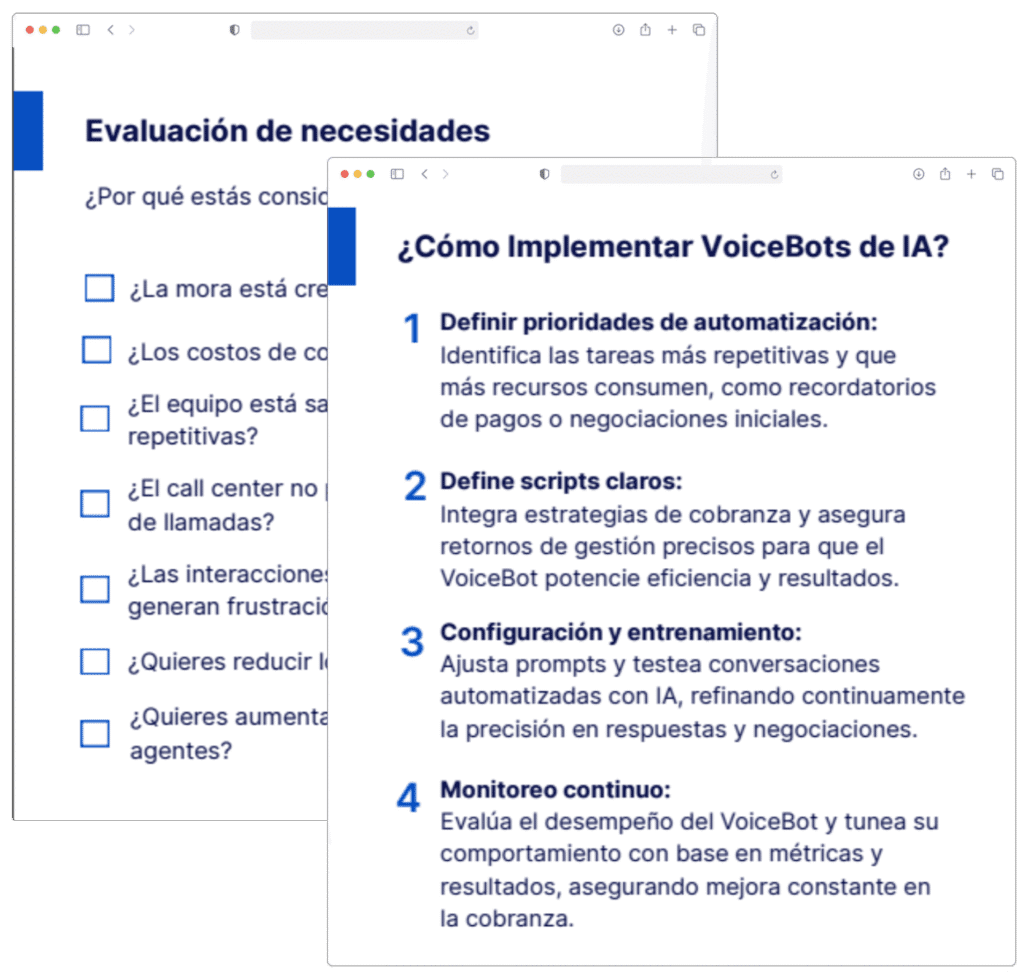 La guía presenta pasos claros para implementar IA en el proceso de cobranza, comenzando con la evaluación de necesidades como la alta mora, costos crecientes y la saturación de las tareas repetitivas. Incluye recomendaciones sobre cómo automatizar tareas específicas, como negociaciones iniciales y recordatorios de pago, y cómo medir la eficiencia a través de KPIs como la tasa de satisfacción y la automatización de llamadas.